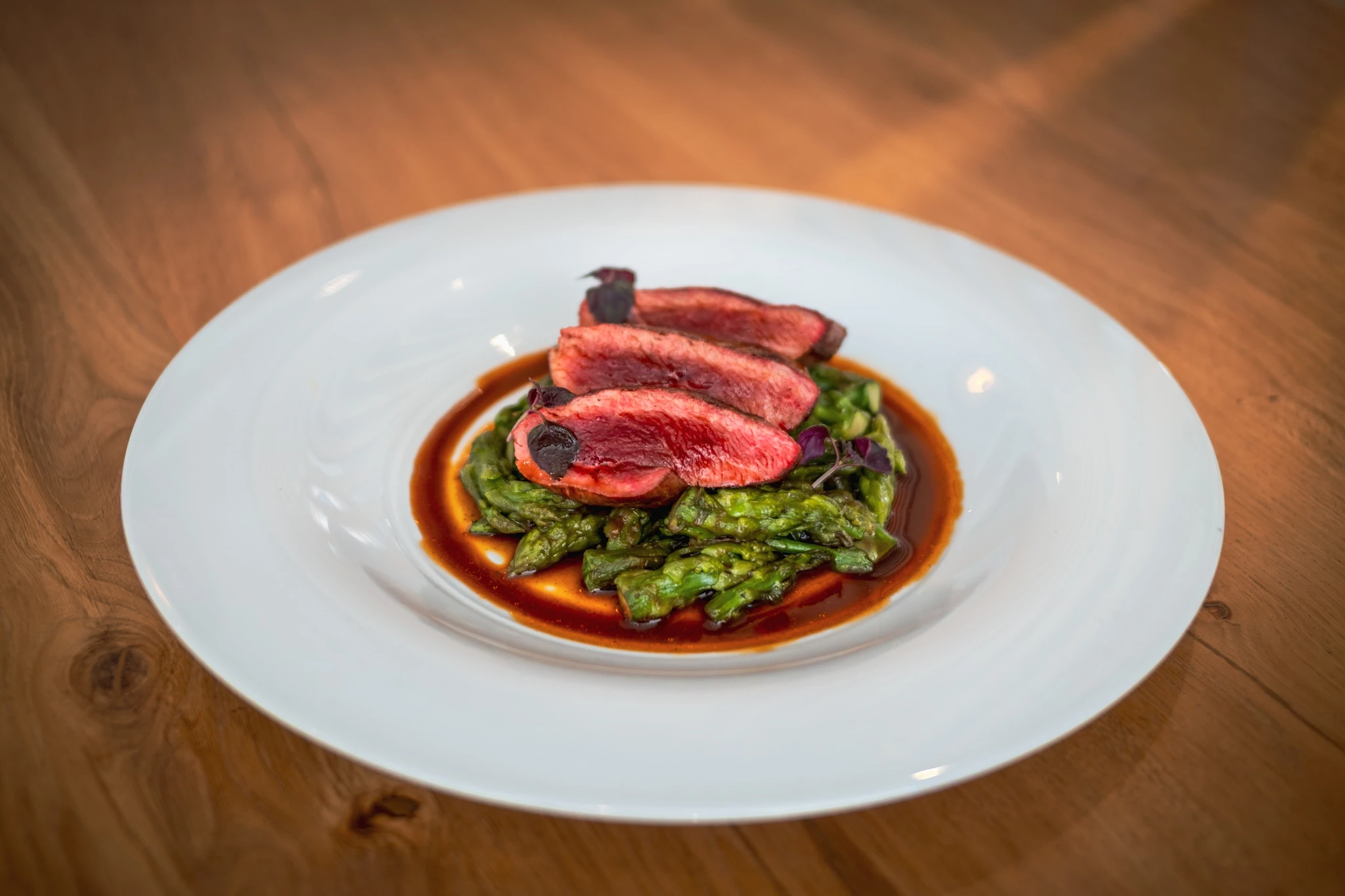 Au sein du restaurant de Saint-Jean-de Monts, l’authenticité des produits locaux se marie avec le raffinement des techniques asiatiques : cuisson au barbecue japonais, fumaison minute, épices rares. Une cuisine savoureuse qui vous fera voyager. Pour vous donner l’eau à la bouche, voici un exemple de plat qui fait le pont entre ces deux univers : le bœuf mariné et snacké, bouillon thaï aux légumes brulés et croquants. Un délice !